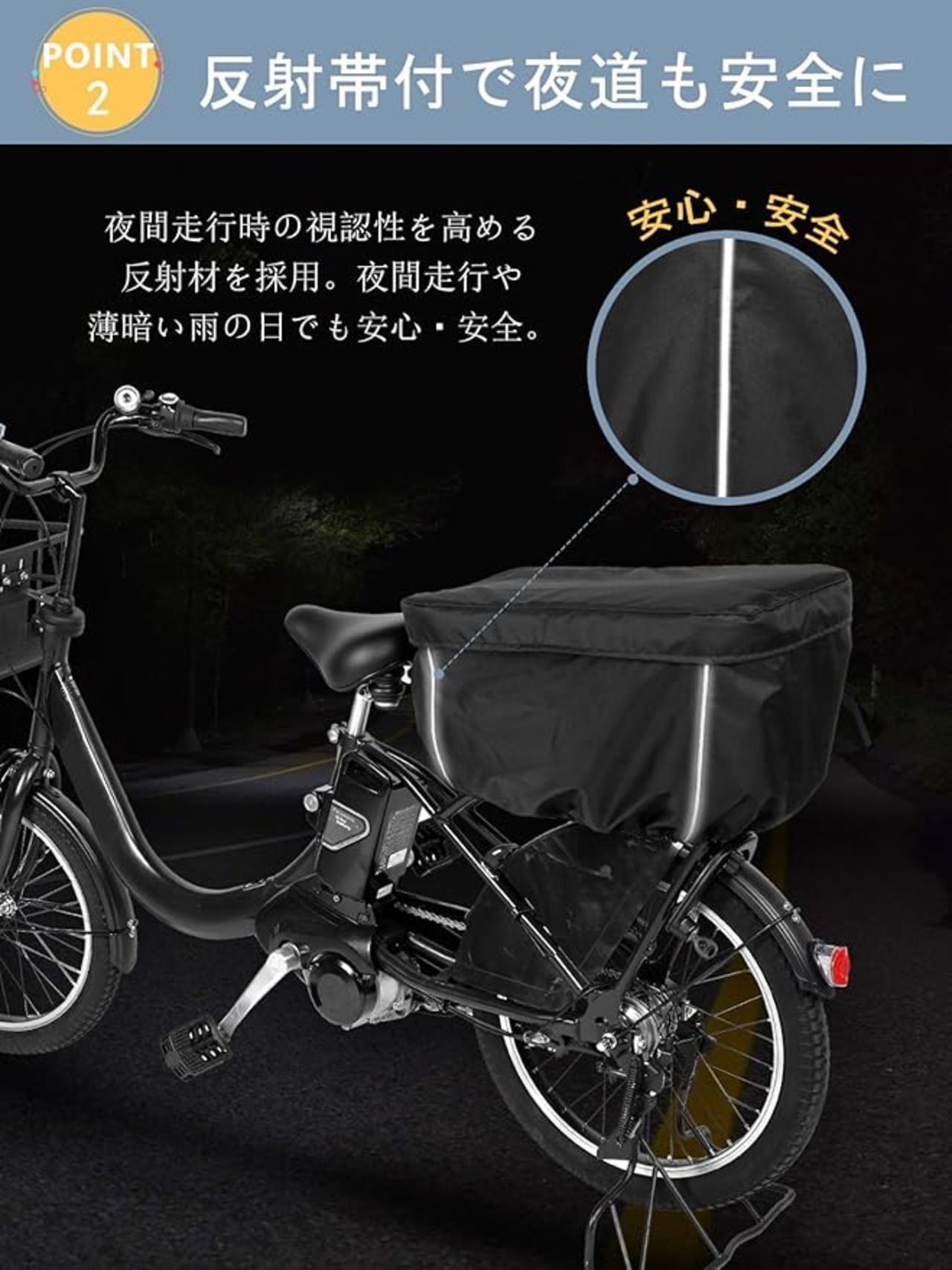 【安心の反射素材付き】:夜間走行時の視認性を高める反射材が採用されました。夜間走行や薄暗い雨の日でも安心・安全です。