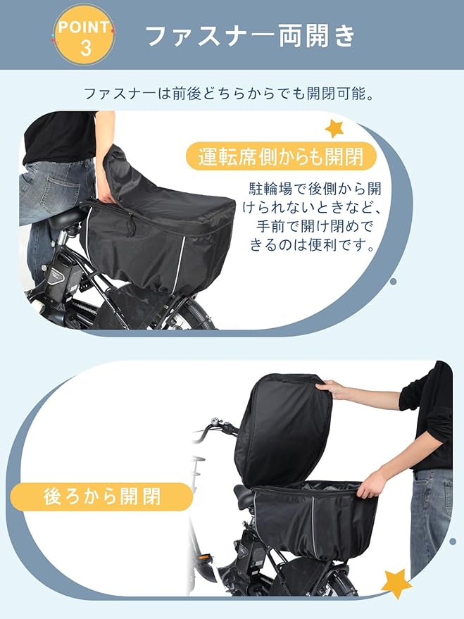 【ファスナー両開き】ファスナーは前後どちらからでも開閉可能。駐輪場で後側から開けられないときなど、手前で開け閉めできるのは便利です。