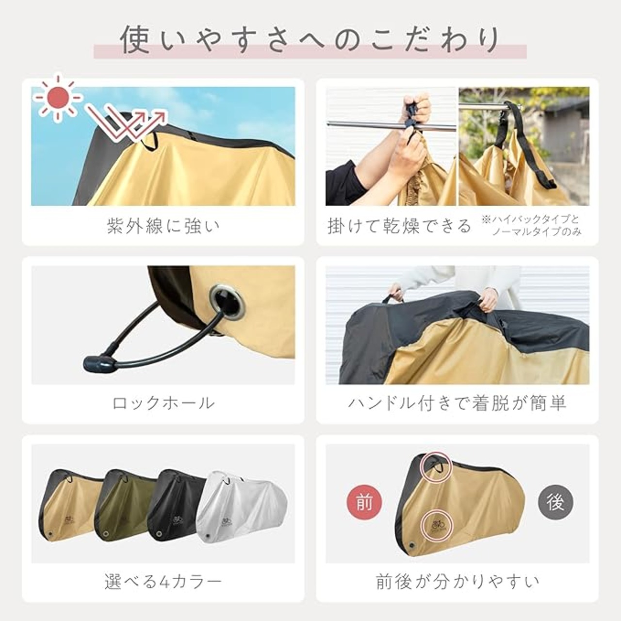 ✅【便利な機能】【固定ストラップ】上下に風飛び防止の固定ストラップがついているので台風や風が強い日にカバーが飛ばされるのを防ぎます。ワンタッチバックルで簡単に着脱できます。※タイプによってバックルの位置や数が異なります。【裾部分のゴム仕様】裾部分がゴム仕様でマチがあるので一人でもカバーがかけやすく、適度な締め付けで自転車を包み込むので下からのほこりを防ぎ、風からも自転車を守ります。【ロックホール】カバーに大き目のロックホール、直径4cm!カバーしたまま、自転車ロックを簡単につけることができます。※前輪に取り付けます。自転車ロックは付属しません。【壁掛け用ループ】丈夫な壁掛け用ループがついているので、ご使用にならないときは壁にかけて収納できます。【収納袋付き】カバーとお揃いのかわいいロゴ入りの収納袋でコンパクトに収納!