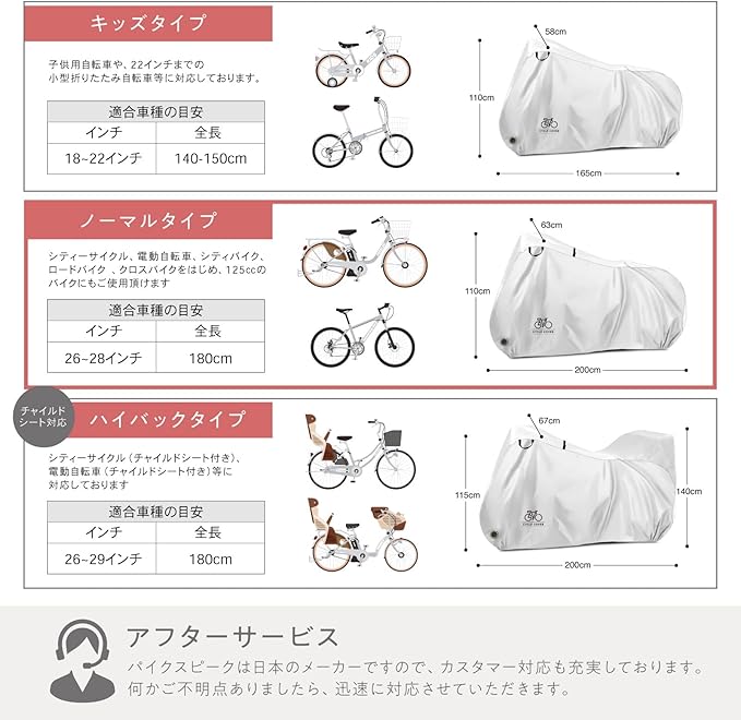 ✅【仕様 / メーカー保証】サイズ:ノーマルタイプ(約)横幅200cm 幅70cm 高さ110cm、ロックホール直径:約4cm【セット内容】自転車カバーx1、専用収納袋x1、取扱説明書x1【メーカー保証】PYKES PEAKは日本のメーカーです。カスタマー対応も日本人スタッフが日本語で丁寧に対応いたします。
