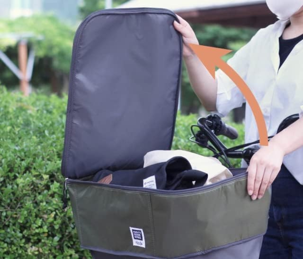 荷物の容量に合わせて高さを調整できるフロントバスケットカバー ファスナー開閉などの面倒な作業が必要なく、簡単に20Lから35Lまで容量アップすることが可能