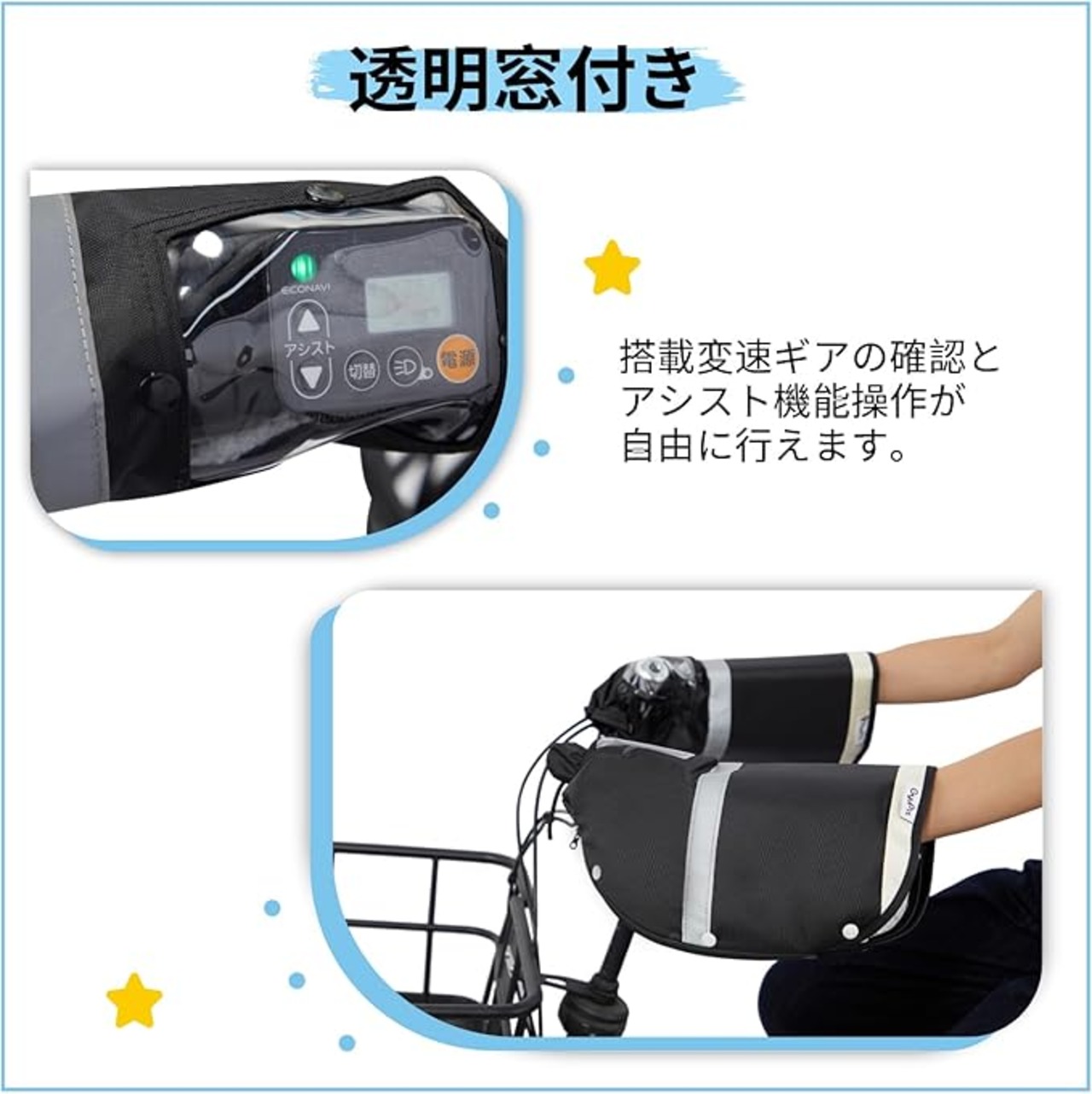透明窓付き:自転車ハンドルカバーにクリアな窓が付いているので、変速ギアの確認とアシスト機能操作が自由に行えます。