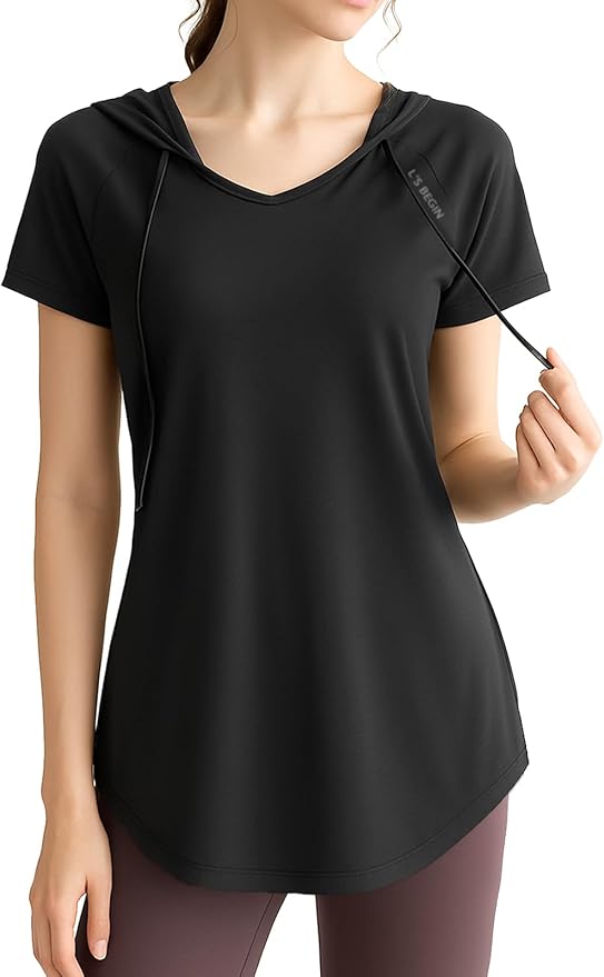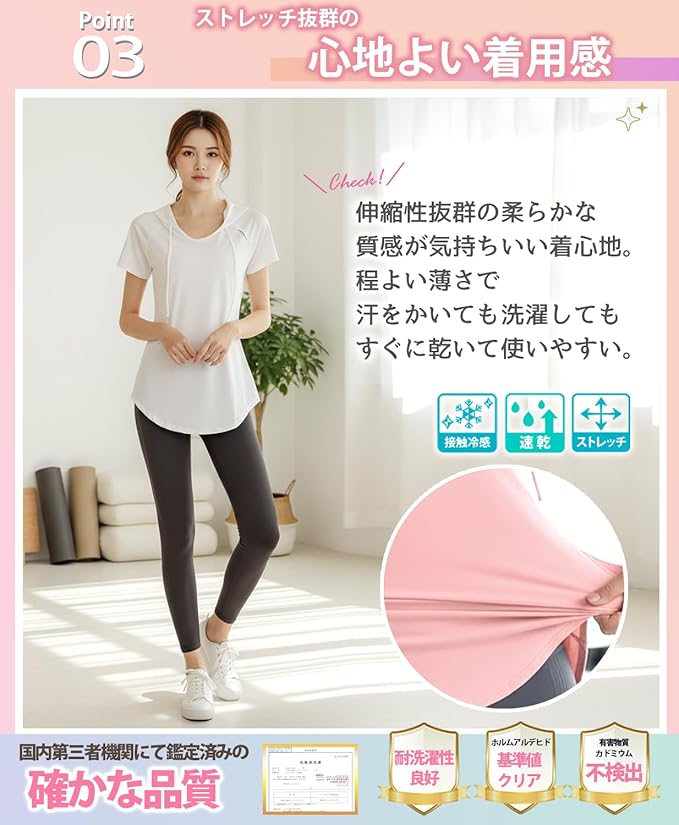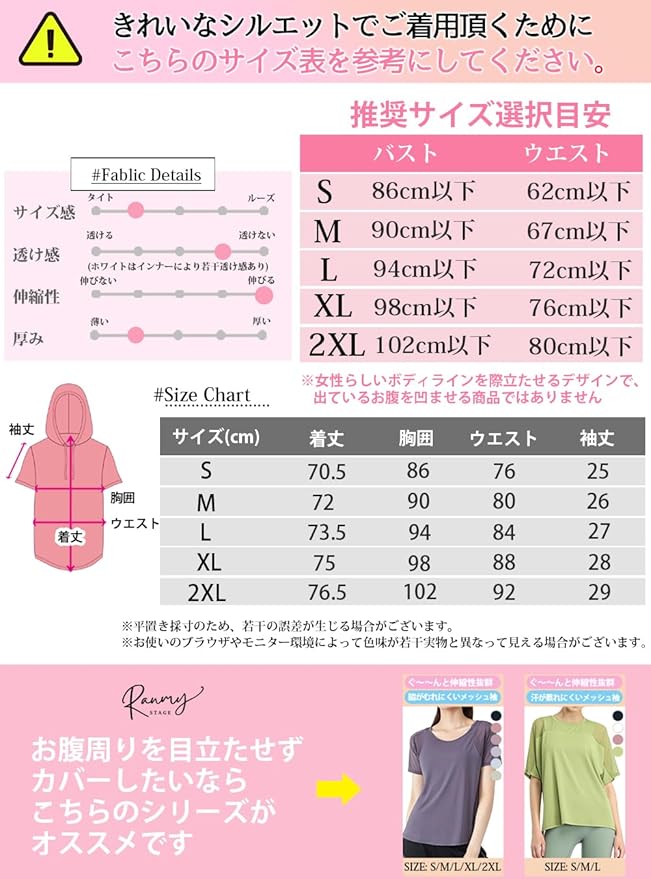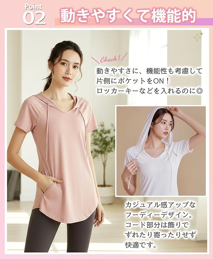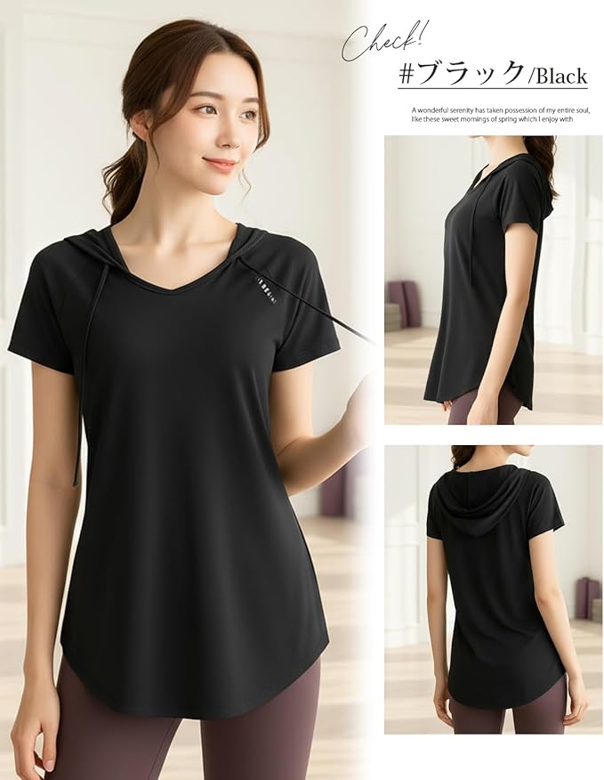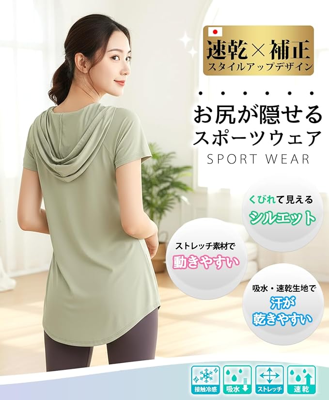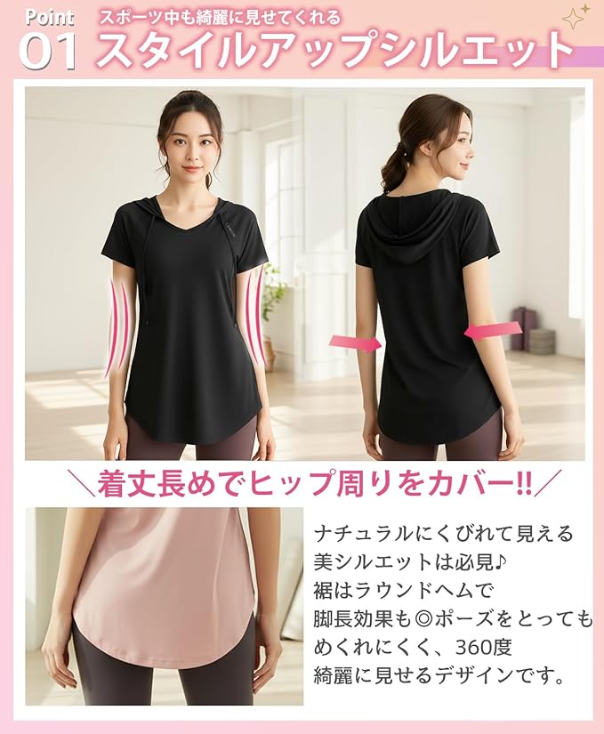 [Ranmy Stage] 【くびれシルエット】ヨガウェア レディース トップス 半袖 フード付き 速乾 丈長め スポーツ ジム トレーニング ランニング ウェア