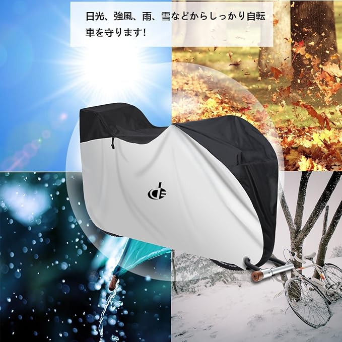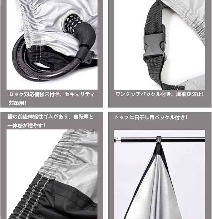 【強風・セキュリティ対策用】:前後の底部は伸縮性ゴムで作られ、調節できる風飛び防止ワンタッチが三つ付き、有効的に風飛びを防止します。前輪にはロック対応補強穴が2つあります、様々なロックにマッチできます、カバーと自転車の一体感が増やすことができます。それに、風で飛ばされることなく、盗難対策もバッチリです。