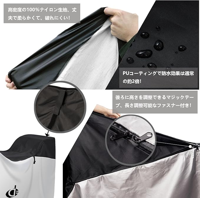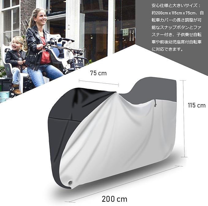 【安心仕様と大きいサイズ】:約200cm x 115cm x 75cm。自転車カバーの長さ調整が可能なスナップボタンとファスナー付き、子供乗せ自転車や前後幼児座席付自転車に対応できます。22 インチ、26インチ、27インチ、29インチまで対応可能です。サイズ調節に便利です。