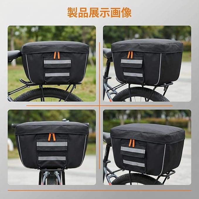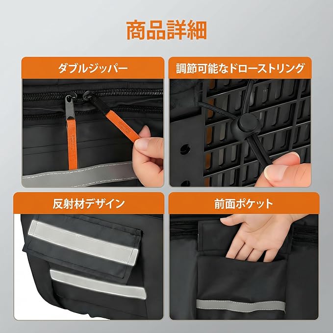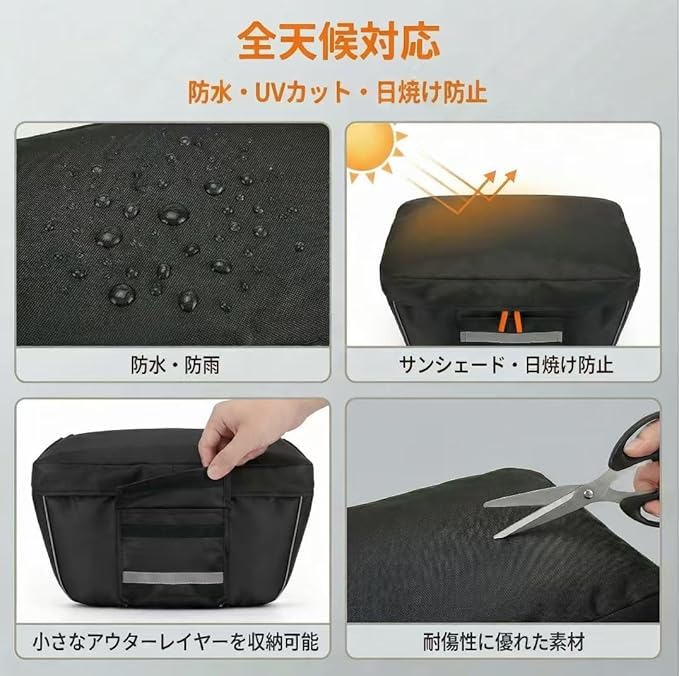 【雨・横風・泥はね対策|レインカバーとして実用的】上からの雨だけでなく、横風で吹き込む雨や路面の泥はねにも配慮。梅雨・台風シーズンの自転車移動で“濡らしたくない荷物”を守ります