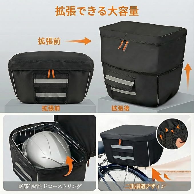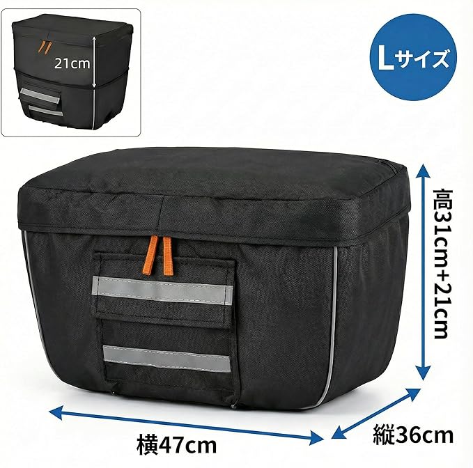 YELKYR 自転車カゴカバー 防水 後ろ用 大型バスケット対応 2段拡張 収納力UP 撥水 雨対策 反射材 ズレ防止 ストラップ固定 プライバシー保護 買い物 送迎 黒 Lサイズ