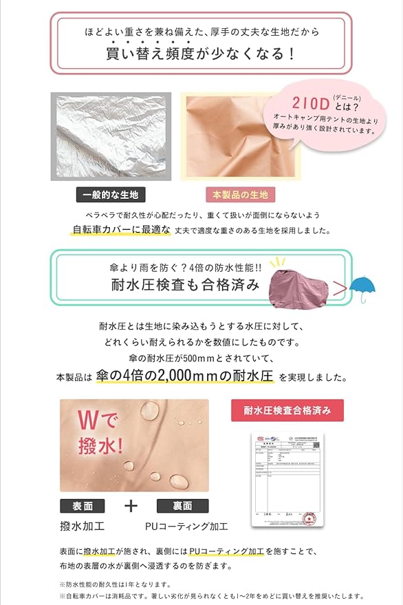 【傘より雨を防ぐ?4倍の防水性能!!耐水圧検査も合格済み】傘の耐水圧が500mmとされていて、本製品は傘の4倍の2,000mmの耐水圧を実現しました。生地の表裏両方に防水加工を施し、耐水圧検査も合格済みです。