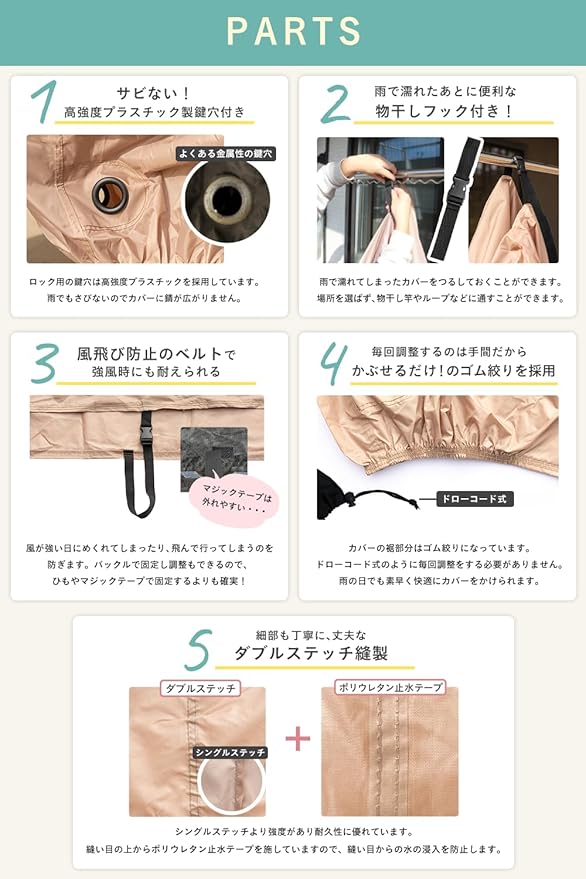 【便利な物干しフック+風飛び防止ベルト付き!】雨でぬれてしまった後も、物干しざおやループに通すことができる物干しフック、さらには、風が強い日にも安心な風飛び防止ベルトがついています! 【仕様詳細】自転車カバー 防水 厚手 電動自転車 6色展開 SOP-CO 【サイズ】200cmx70cmx110cm