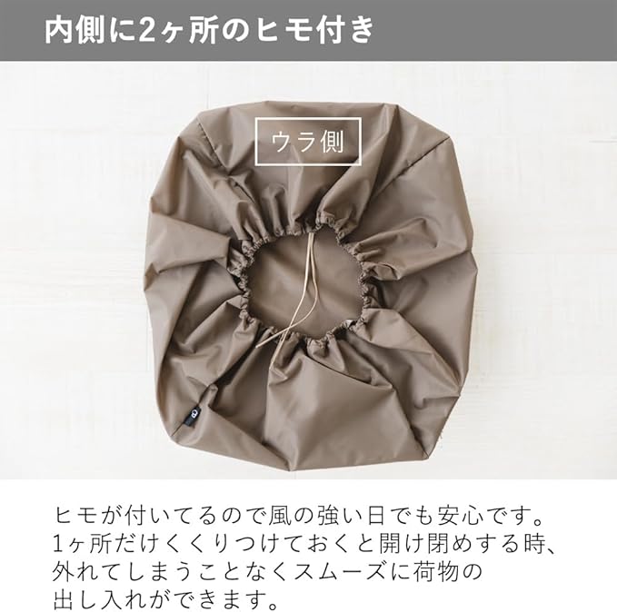 ゴムでかぶせるだけで大きめのカゴもOK 。ゴム取り換え用の目印ループ付き