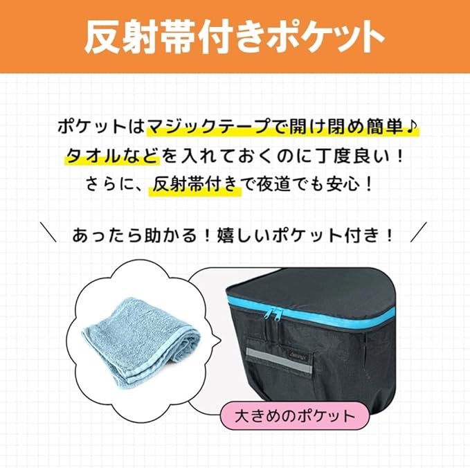 【ポケット】前部分にマジックテープで開閉するタイプ。ビニール袋やタオルなどを収納できます。「サイズ:横 約17cm 縦 約18cm」 【カバー内側】カバー内にはズレを防ぐひもが付いておりキッチリとかごと前かごカバーを繋ぎ止め固定できます。 様々な大きさのかごに対応できるようにマジックテープでかごの大きさに調整可能です。