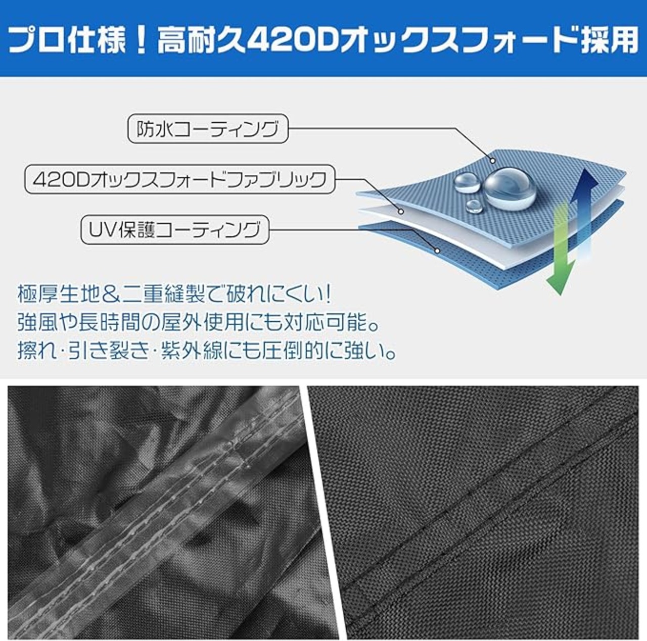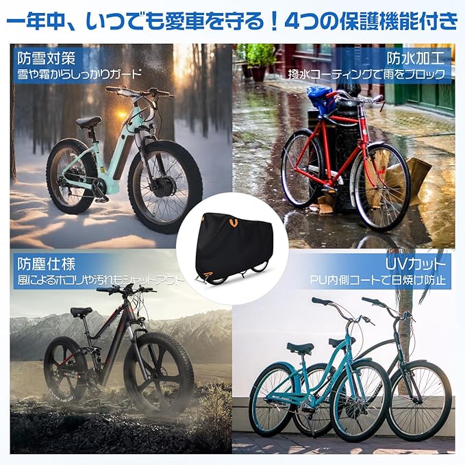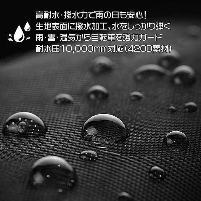 【防水性能強化|耐水圧10,000mm】 高撥水コーティング+防水PU層により、耐水圧は安心の10,000mm。縫い目もダブルステッチでしっかり防水加工済み。梅雨・ゲリラ豪雨・雪の日でも大切な自転車をしっかり保護します。通勤・通学・旅行先の急な天候変化にも心強いアイテムです。