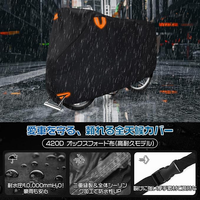 【420D厚手・破れにくい高耐久設計】 この自転車カバーは420Dオックスフォード布を採用し、210Dや300Dを超える耐摩耗性・引裂強度を実現。屋外駐輪場での風雨や紫外線にも強く、日常使いはもちろん、雨の多い季節やアウトドア・防災備品としても最適です。電動自転車など重めの車体にも対応できるタフ設計。