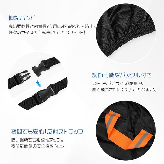 【三重固定構造|強風でもズレにくい】 前後輪部分に固定ストラップ、中央部には調整式バックルベルトを配置し、裾には伸縮ゴムバンドを内蔵。自転車カバーが風でバタつくのを防ぎ、屋外での使用も安定。キャンプ場・海辺・山間部など風が強い場所でも安心して使用可能です。