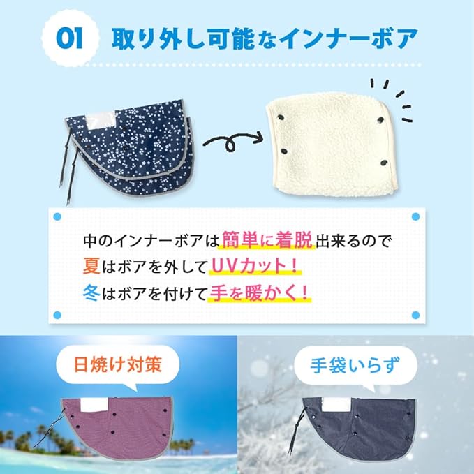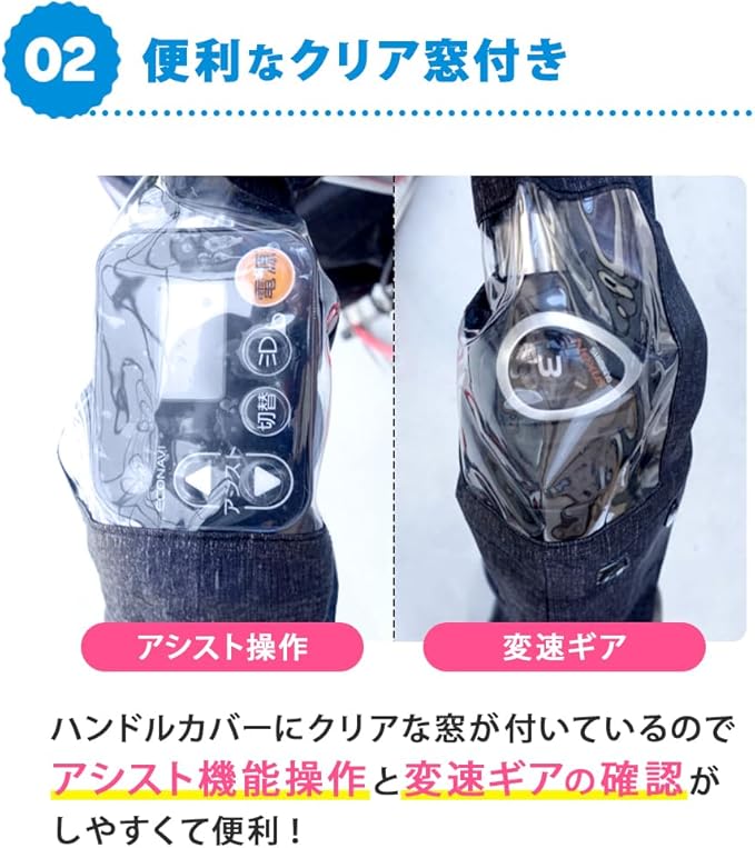 ・夏の暑い時期にはハンドルカバー内のボアを取り外し真夏の太陽の紫外線防止/UVカットとしても使えるので使い勝手の良いハンドルカバーです。 ・クリアな窓を搭載。変速ギアの確認やアシスト機能操作などの自由に操作が行えます。 ・ハンドルカバーの取り外しもとても簡単です。