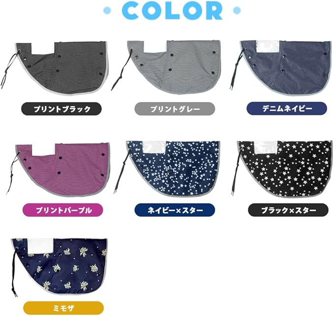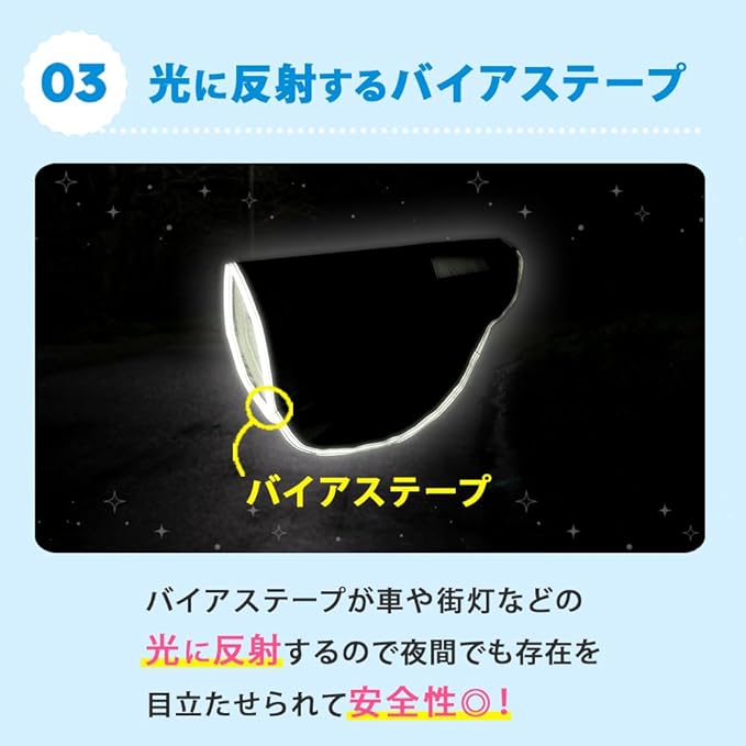 ・ハンドルカバーとハンドルの固定はスナップボタンと紐を使うのでしっかりと固定が行えます。 ・反射バイアステープは薄暗い雨の日や夜道の車のライトを反射し存在感をアピールできる安心の仕様!