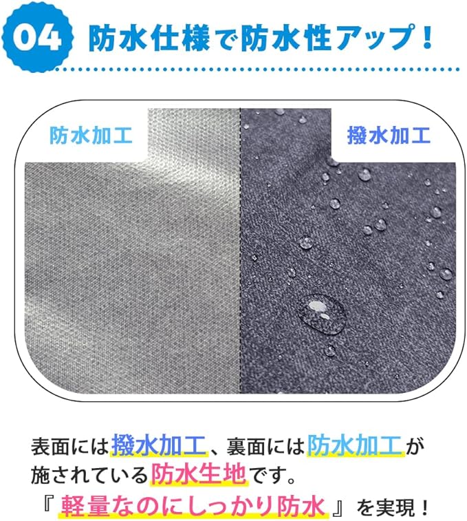 【防水性】裏面には防水(PUラミネート)生地使用。しっかり防水なのに超軽い!「防水、軽量素材」を実現しました。 【撥水性】雨や水しぶきをはじいてくれます。水滴を垂らすと滑らかに滑り落ち乾いた状態を維持することができます。