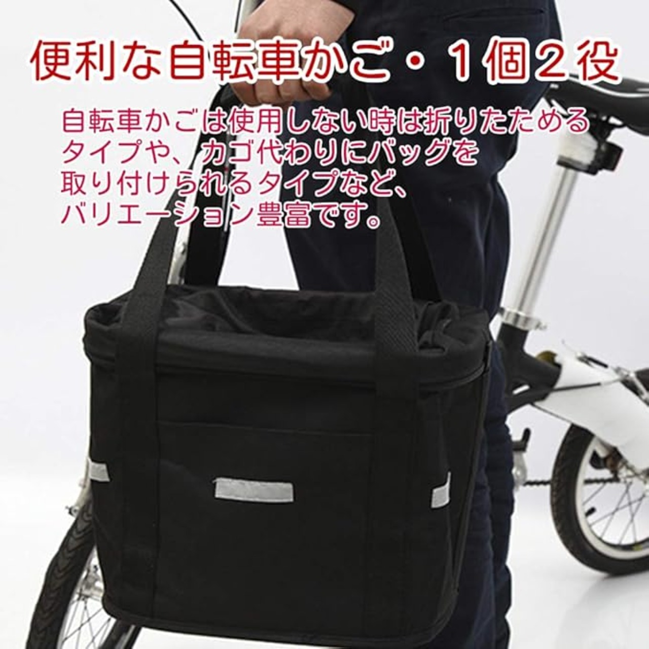 【着脱簡単】自転車のハンドル部分に引っ掛けるタイプのカゴ。さっと手軽に脱着できるから折りたたみにも支障なく買い物のときは手提げにもなるあると便利なカゴです。(ハンドルバーの直径サイズに適しています:22cm-32cm。)