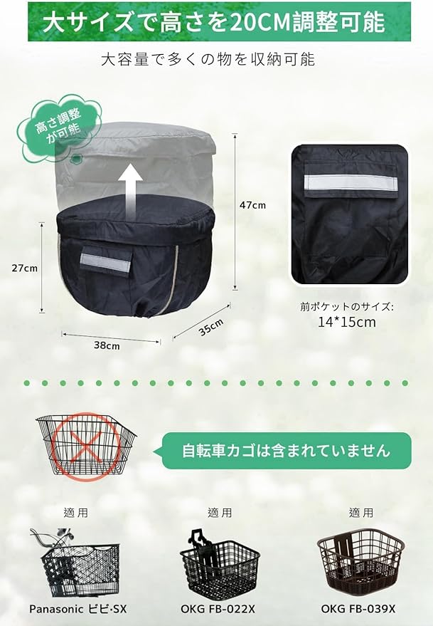 【幅広い対応】サイズ調整可能(38*35*27-47cm、高さ20cm調整可)で、ほとんどの自転車カゴや電動自転車バスケットにフィット。購入前にカゴのサイズを確認してください。