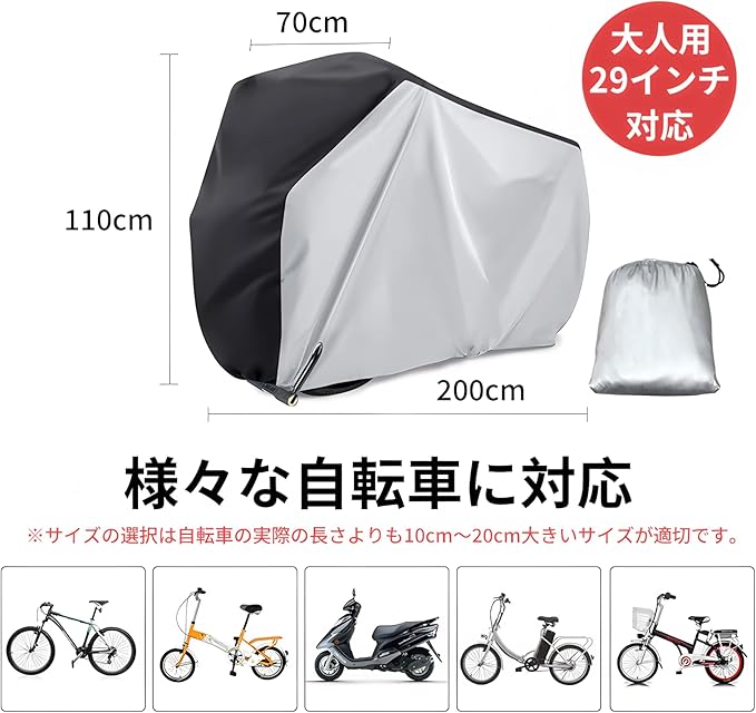 自転車カバー 厚手 丈夫 破れにくい 防水 サイクルカバー 200x110x70cm 大人用 29インチ対応 210D 防犯 防風 鍵穴盗難防止 雨雪対応き 風飛び防止 ロックホール 収納袋付き (シルバー, XLサイズ1点)
