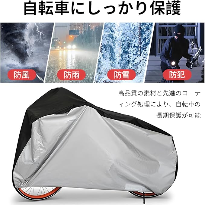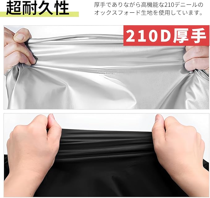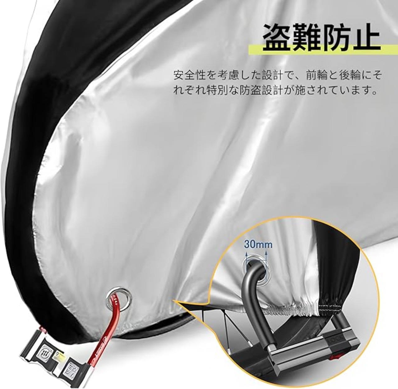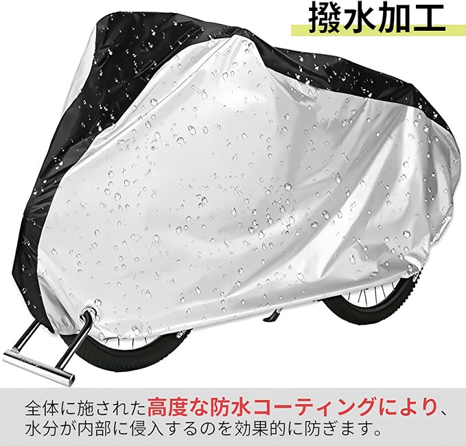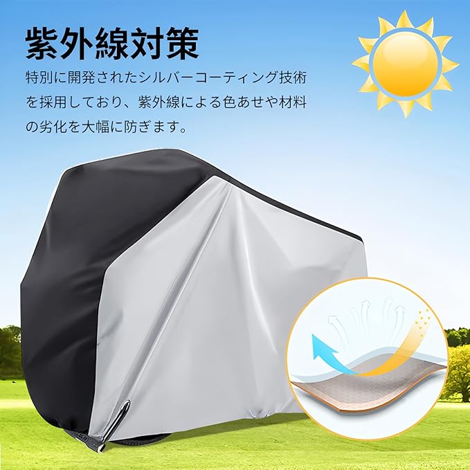 【紫外線対策と耐久性】 当社の自転車カバーは、シルバーコーティング技術を採用し、紫外線による色あせや劣化を防ぎます。210デニールの高密度オックスフォード布を使用しており、軽量ながらも引き裂きに強く、長期間の使用に耐える耐久性を実現しています。