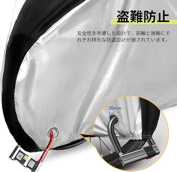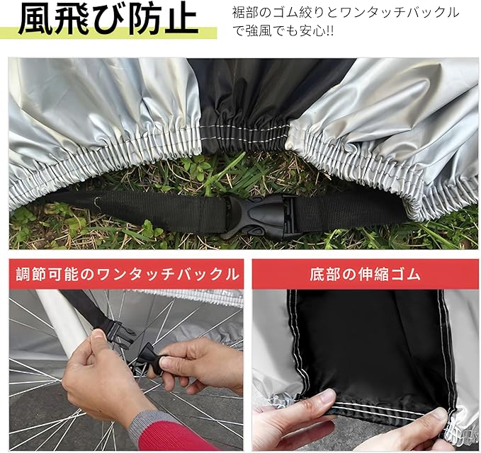 【盗難防止&風飛び防止機能】 前輪にはロックホールを設け、自転車ロックを通して盗難を防止。後輪にはワンタッチバックルを装備し、強風時でもカバーが飛ばされないよう固定します。
