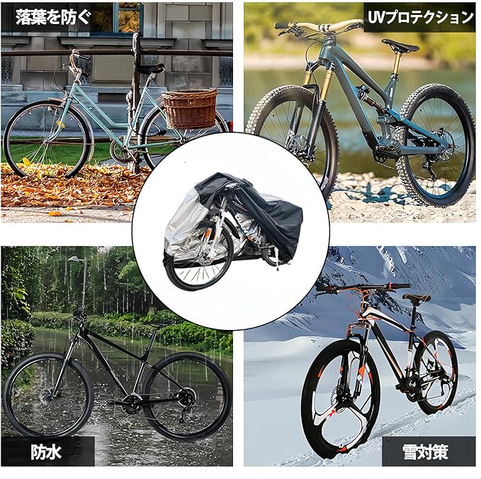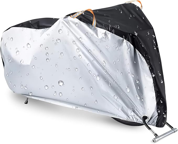 【高耐久性】自転車カバーは本織りグレードの210D牛首布で作られ、0.8mm厚、破れにくい、50%高い経年強度、PUコーティングと銀膜防汚層はUPF50+防汚性能と3000mm防水性能を提供します。大雨、直射日光、霜、砂から愛車を守ります。