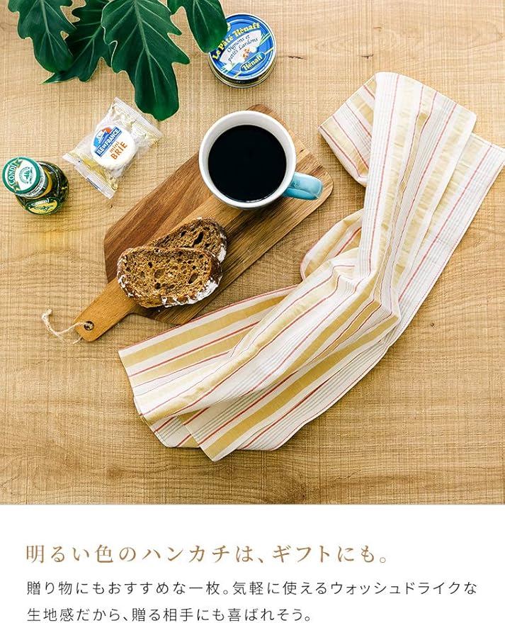 明るい色のハンカチはギフトにもおすすめです。気軽に使えるウォッシュドライクな生地感だから、贈る相手にも喜ばれそう。
