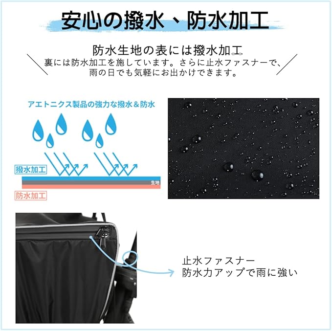 優れた防水・耐水性:表面には撥水加工、裏面には耐水圧加工(2000mm)が施されている防水生地です。水分が生地の内側まで染み込むことがありません。
