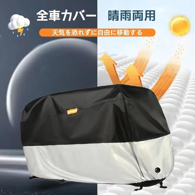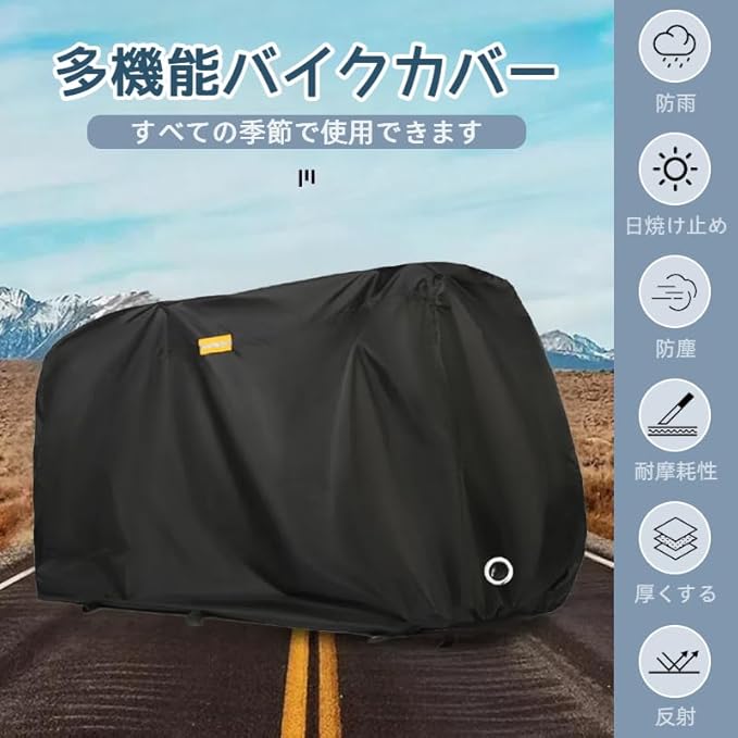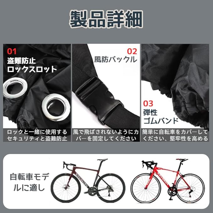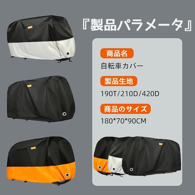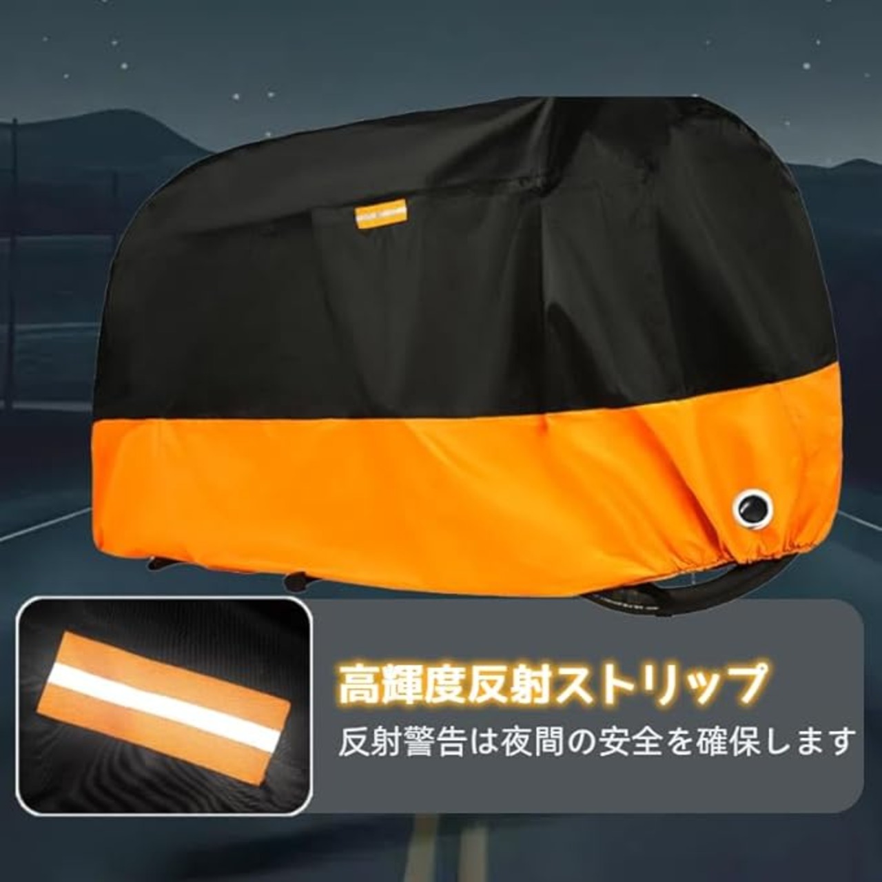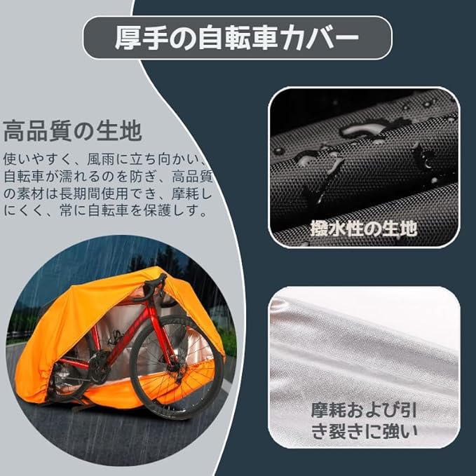 【高い撥水効果&UV加工】撥水加工の効果は通常の2倍、UVカットとシルバーコーティングでカバーや自転車本体の劣化の原因となる紫外線を反射して大幅にカットします。UV加工を施している自転車かばーで、より強い糸を使用しているため紫外線にも強く、しっかりと自転車を守ってくれます。それに、風の侵入を防ぎバタつきを抑え、雨、雪、ほこり、ゴミ、摩擦などから最小限に抑えることができます。