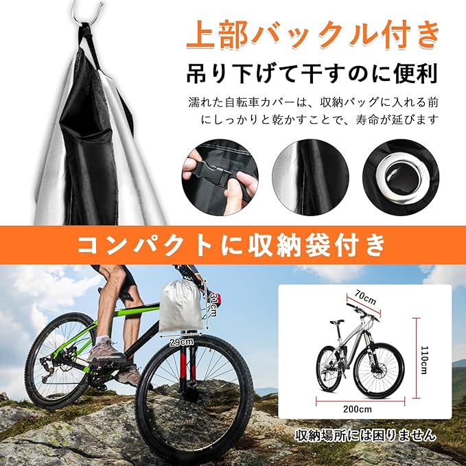 【専用設計|29インチ大型自転車に完璧フィット】サイズは200*70*110cm。29インチをはじめ、27.5インチ、26インチなどのマウンテンバイクやシティサイクルまで、すっぽりと全体を覆い、雨やほこりからしっかり守ります。