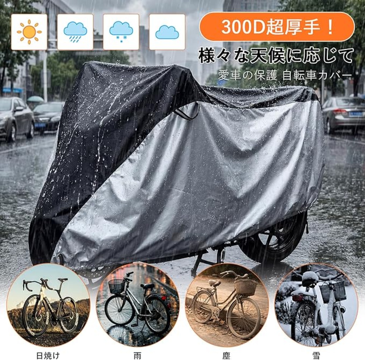 【3大機能|日よけ・防塵・防水を一枚で解決】屋外駐輪の悩みをまとめて解決。紫外線、雨水、ほこり、花粉、鳥のフンなどから、面倒な洗車や手入れの頻度を減らし、常に清潔な状態を保ちます。