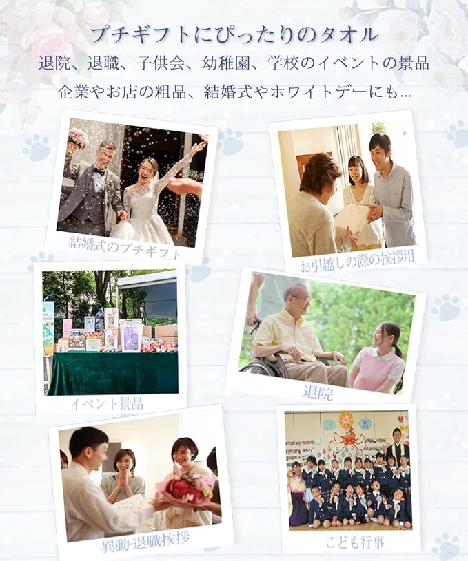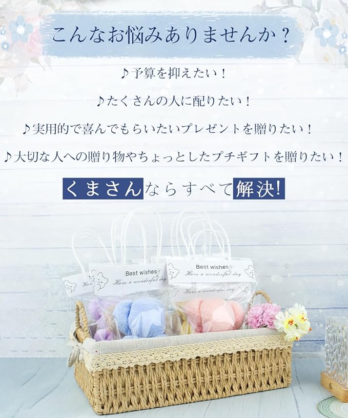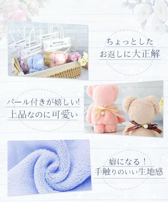 【プチギフトに最適♪】女性に大人気♪かわいいくまさんの手作りタオルセットです。結婚式のプチギフトをはじめ、ホワイトデー、引っ越し先のご挨拶、退職や転勤時にお世話になった職場の方へのお礼品、クリスマス、イベントやパーティーの景品、企業様やお店の粗品、新年会の記念品の一部などにおすすめです。子供会、幼稚園、学校行事や地域活動の記念品としても重宝します。さらに、全て日常的に使用できるものなので、一人暮らしのご家族や友人にプレゼントにも喜ばれます。見た目も中身も贈り物にぴったりです!(※くまのタオルを整えてからプレゼントするのがおすすめです。)