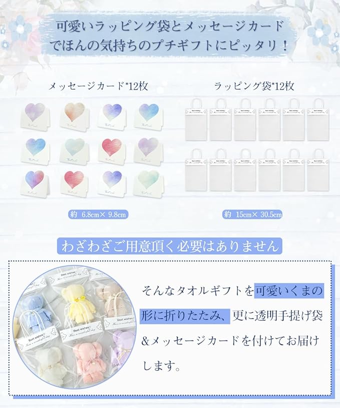 【商品内容】プチギフト ベアタオル 12個、opp透明手提げ袋 12個、メッセージカード 12枚【カラー】ホワイト、ブラウン、ブルー、ピンク、イエロー、パープル【サイズ】ハンカチサイズ:約29 29cm、クマさん本体サイズ:約15 11cm、手提げ袋サイズ:約15 20.5cm (持ち手部分約10cm)、メッセージカードサイズ:約6.8 9.8cm(※省スペース設計のため、透明袋にて表6個+裏6個の背中合わせ包装となっております。お手元に届きましたら、包装袋から中身を取り出し、全12個クマタオルとカードなど付属品をご確認いただきますようお願い申し上げます。)