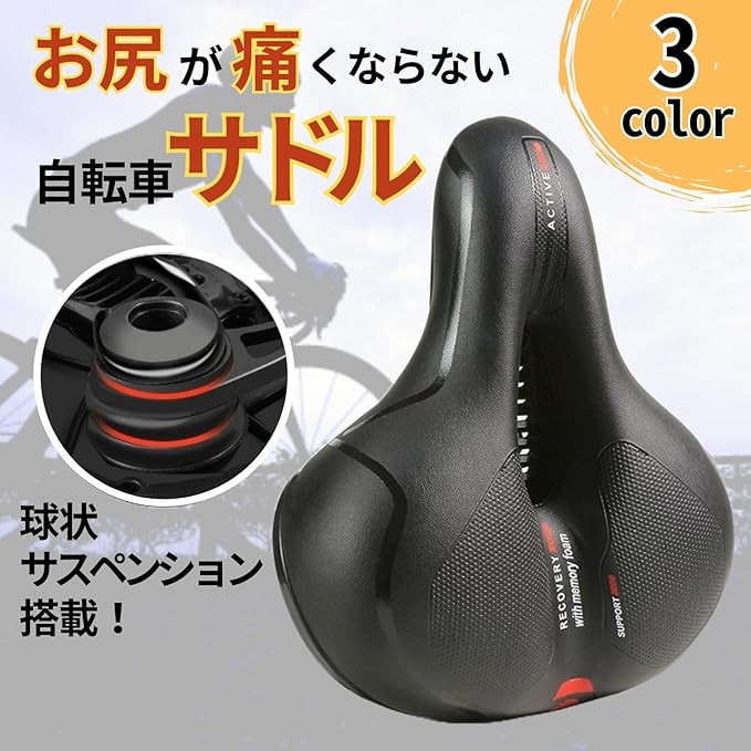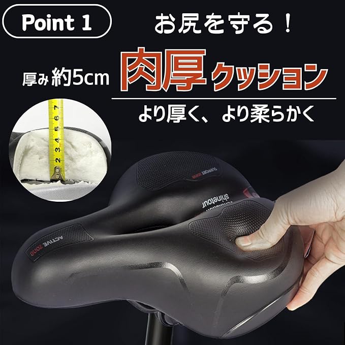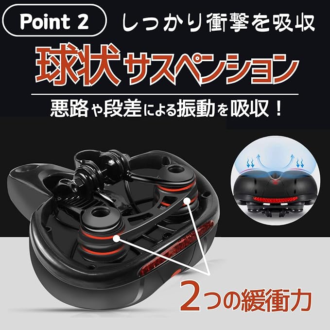 【最高の快適性】痛みを感じることなく、長時間のライドを楽しめるように、高密度クッションが施されています。滑り止め加工がされた座面は、不快なズレを防ぎ、腰への負担を軽減します。さらに、二つの球状サスペンションが衝撃を緩和し、快適な走行をサポートします。