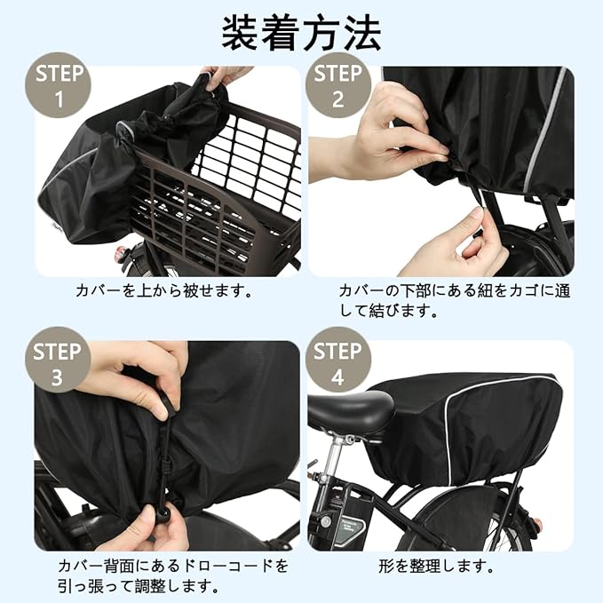 取り付け簡単:カゴにカゴカバーをかぶせて、ストラップを固定するだけで取り付け完了!