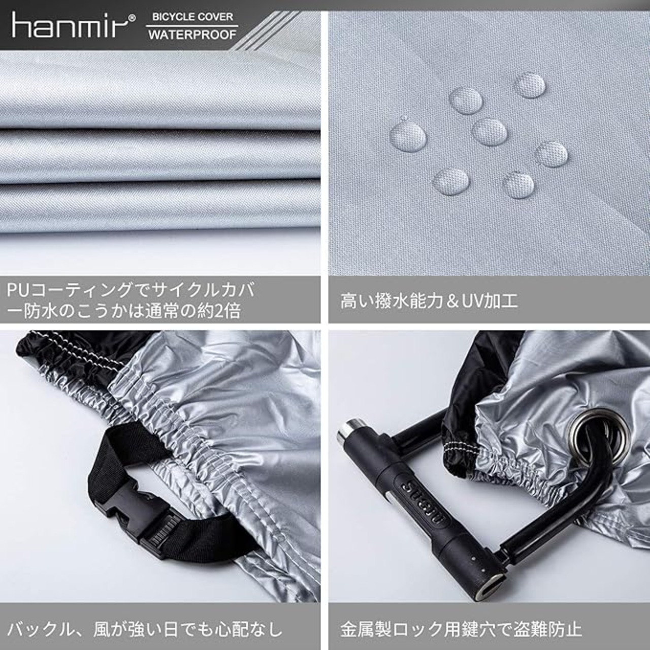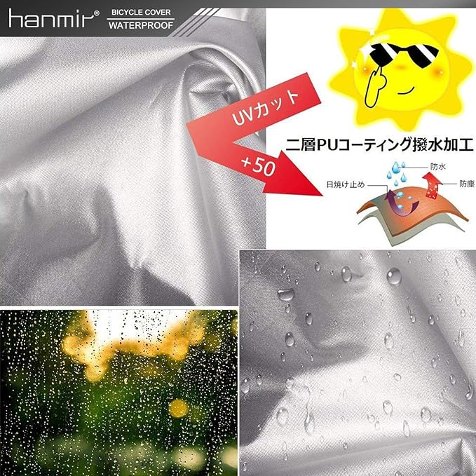 【高い撥水効果&UV加工】撥水加工の効果は通常の2倍、40+UVカットとシルバーコーティングでカバーや自転車本体の劣化の原因となる紫外線を反射して大幅にカットします。UV加工を施している自転車かばーで、より強い糸を使用しているため紫外線にも強く、しっかりと自転車を守ってくれます。それに、風の侵入を防ぎバタつきを抑え、雨、雪、ほこり、ゴミ、摩擦などから最小限に抑えることができます。