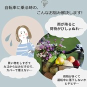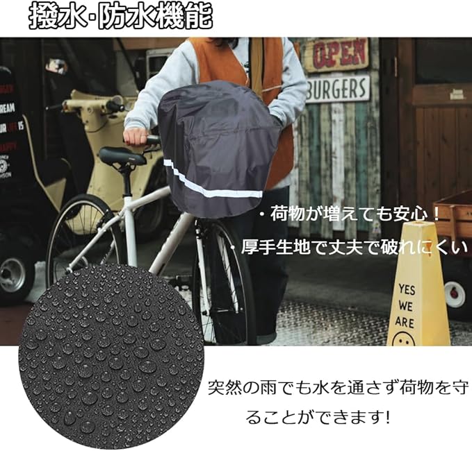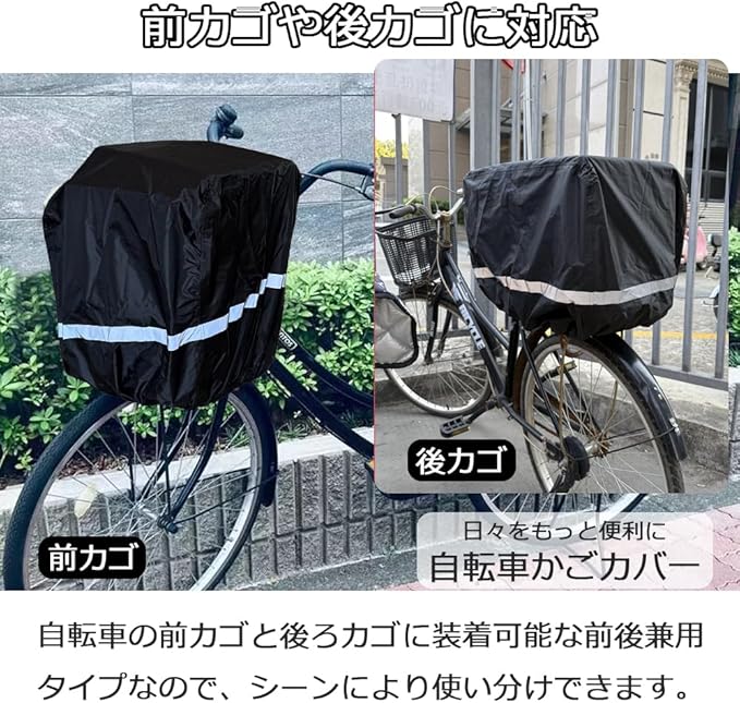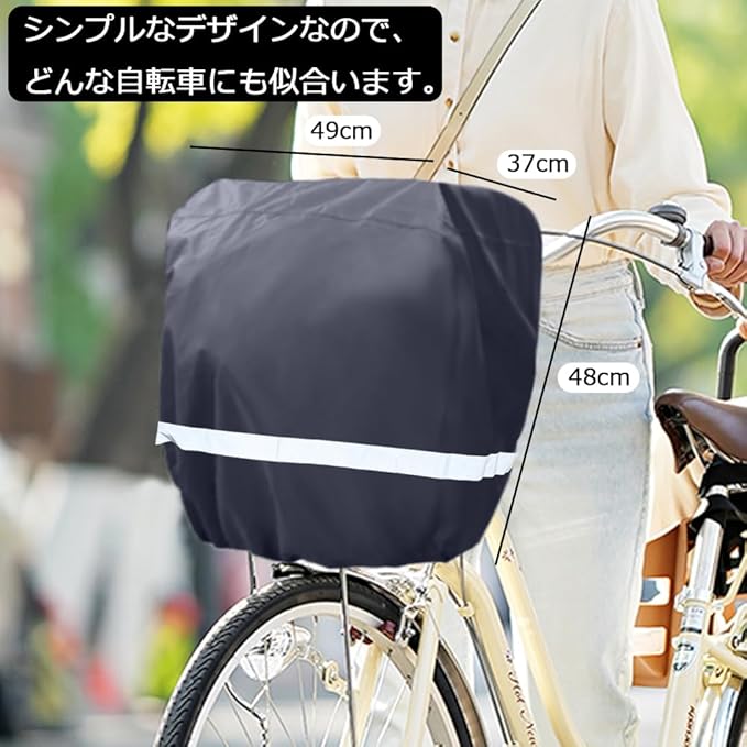 **簡単で安全な取り付け** 100%ポリエステル素材を使用し、自転車のカゴに被せるだけで簡単に取り付け可能です。取り外しもストレスなく行えます。全周に反射帯を装着しているため、夜間の走行でも安全性が高く、安心して移動できます。