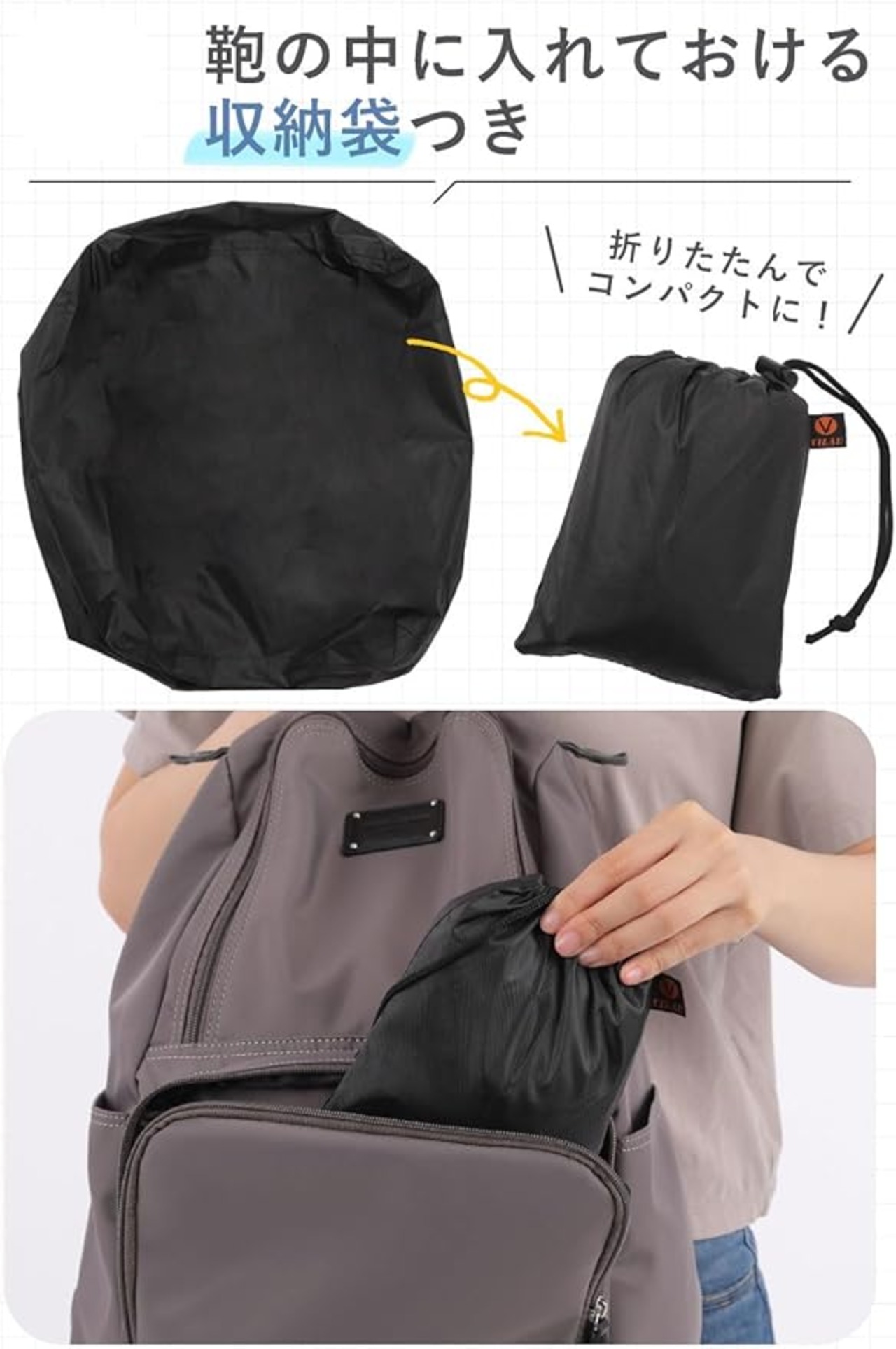 収納袋が付属 専用の同カラー収納袋が付属しております為。濡れた状態でも折り畳んで収納袋に入れる事でバッグの中が濡れにくくなっております。