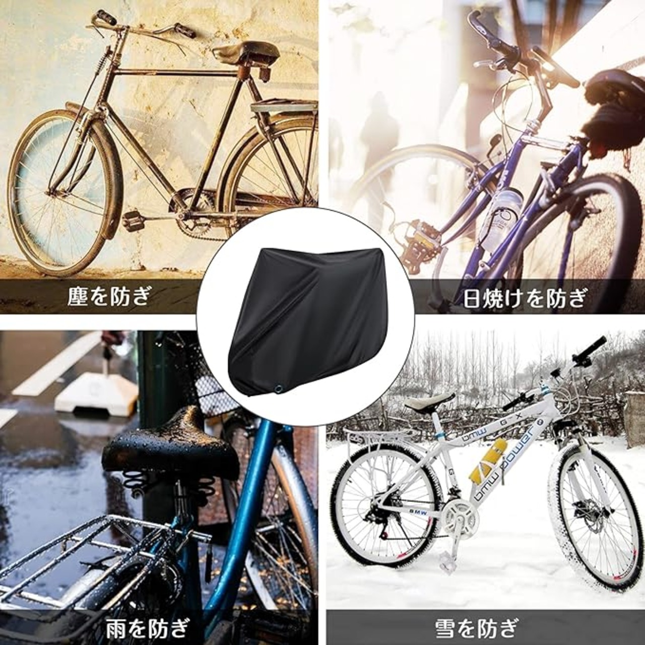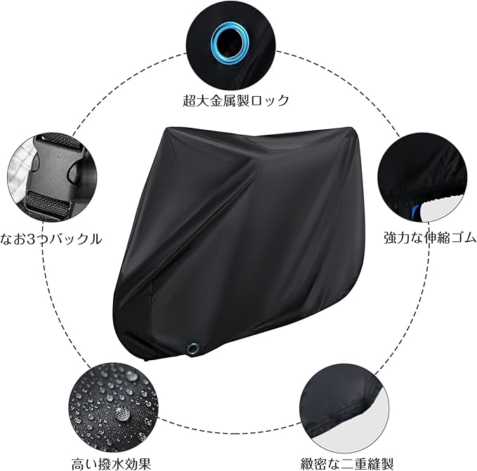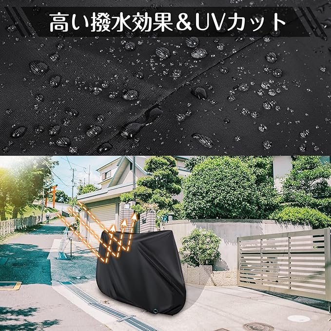 【水滴をしっかりガード・超撥水】表面にPUコーティングを施しているので撥水効果も抜群。水が入らないよう縫い目にも止水テープを施しているので、一般自転車カバーの2倍以上の撥水力を実現しました。雨 だけでなく、 雪 や 埃や汚れやサビからも自転車を守ります。(monikoの自転車カバーはご購入日からご購入日より1年間何度でも補償いたします(自己破損、経年劣化にも対応)。)
