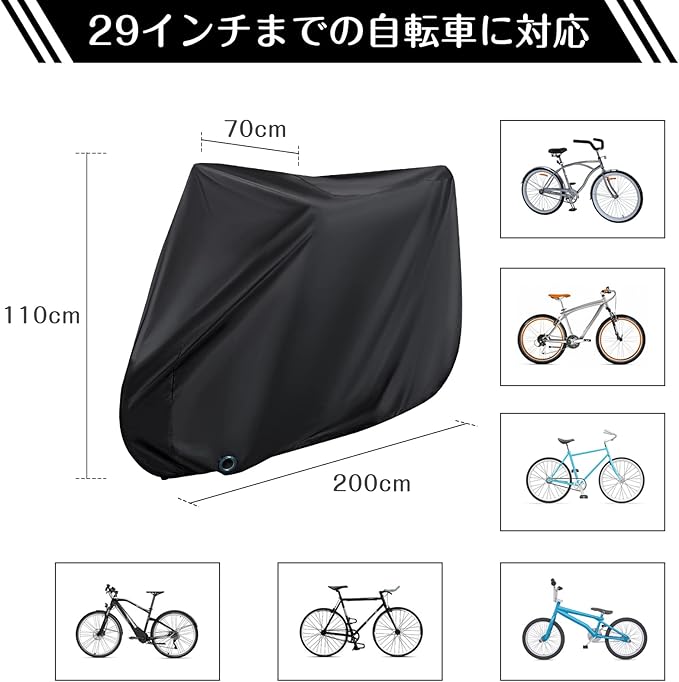 【さまざまな自転車に対応】スポーツサイクル、ママチャリ、折りたたみ電動自転車スクーターなども使えます。カバーのサイズは200cm *110cm *70cmほどなので、29インチまでの自転車や27インチまでのバイクに対応しています。