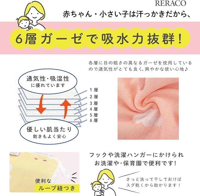 【6重ガーゼ 綿100%】優しい自然な手触りのベビーガーゼタオルで、お手ふきや口拭きタオルの他、よだれかけ