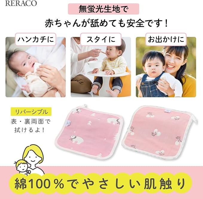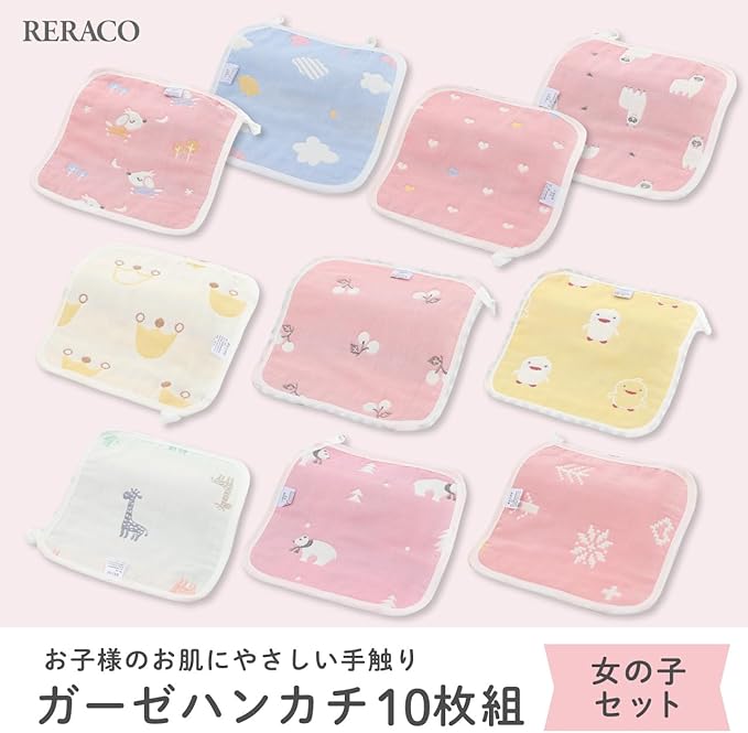 RERACO ガーゼハンカチ ガーゼタオル ループ付きタオル 赤ちゃん 子供 6重ガーゼ 綿100% 柔らかい 女の子 保育園 お手拭きタオル ハンドタオル (女の子用10枚セット)