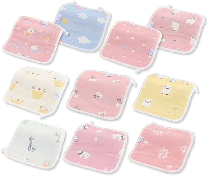 【柔らかいガーゼハンカチ10枚セット】赤ちゃんから子供まで♪ 女の子用のかわいいループ付きタオルです。10枚セットなので、しょっちゅう汚してしまうベビーや子供にとっても便利です。