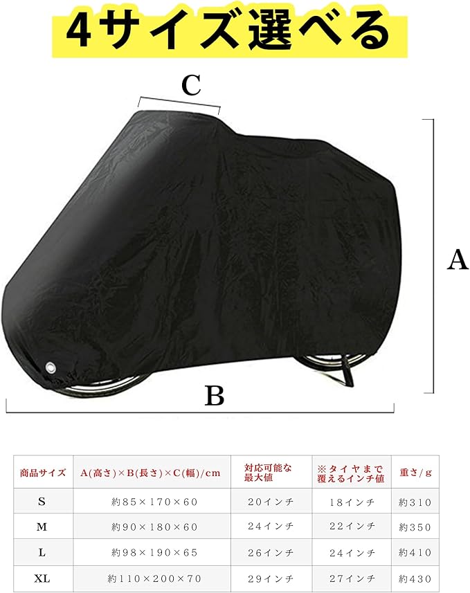★【4サイズから選べる】 S/M/L/XLの4つのサイズからお選びいただけます。マウンテンバイク、ロードバイク、クロスバイク、ミニベロ、電動自転車、原付など、さまざまなタイプの自転車にも対応可能です。 ※タイヤまで覆えるのは27インチまで。自転車のサイズに合わせてを選んでください。(一部の特殊な車種には、対応できない場合があります)