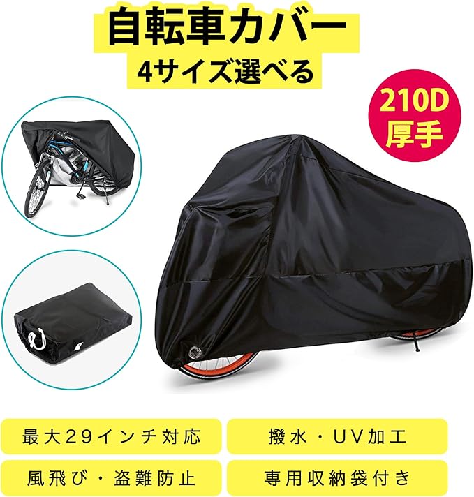 自転車カバー サイクルカバー 4サイズ選べる 最大29インチ対応 防水 厚手 210D 撥水加工 UV加工 盗難防止 破れにくい 防風バックル付き ロック穴付き 収納袋付き まくれ防止 solathree (S(20インチまで))
