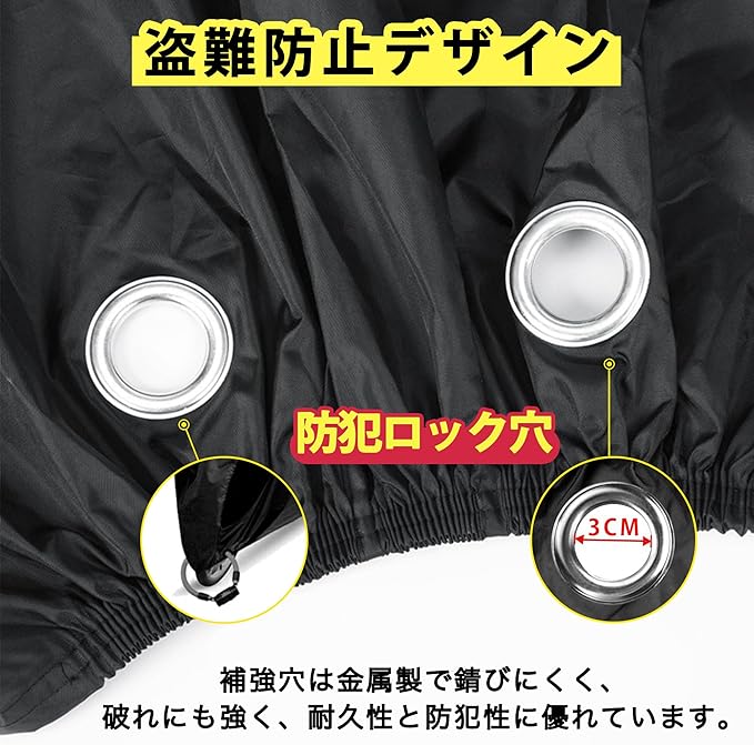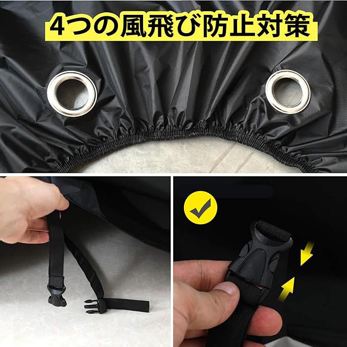 ★【4つの風飛び防止対策】 車体にフィットする立体構造で、タイヤまですっぽりカバーできます。前後の裾は伸縮性のあるゴム仕様で風の影響を受けずにフィットします。後輪には着脱が簡単なワンタッチ式のバックルが付いており、強風対策も万全です。また、ロック穴も設けられ、風による飛び上がりを強化します。