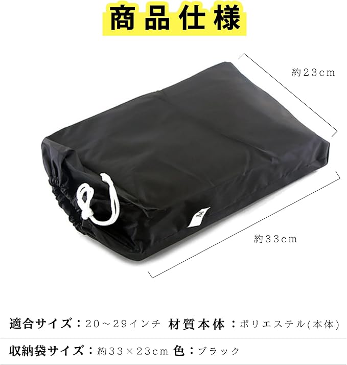 ★【商品仕様】 材質:ポリエステル(本体) 色:ブラック 適合サイズ:20~29インチ 収納袋サイズ:約33 23cm ※表記寸法には多少の公差があります。ご了承下さい。