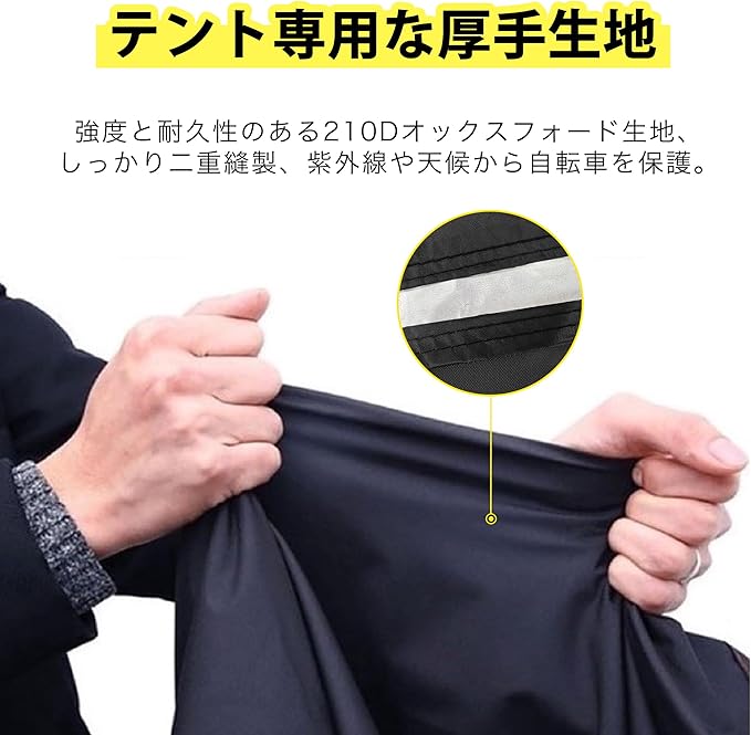★【テント専用の厚手生地】 強度や耐久性に優れる210Dオックスフォード生地を採用し、ビニール素材の従来品よりも厚く、破れにくい作りです。スソはしっかりと二重縫いで丈夫に仕上げられており、まくれ防止にも役立ちます。紫外線、雨、雪、落ち葉、鳥の糞、風、ほこり、傷などから自転車を万全に保護します。