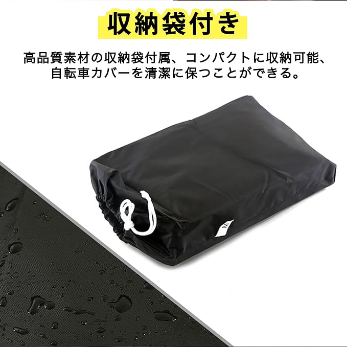 ★【収納袋付き】 本体と同じ高品質素材の収納袋が付属しています。未使用時や持ち運び時にはコンパクトに収納できます。自転車カバーを折りたたんで収納することで場所を取らず、いつも清潔に保つことができます。*パッケージの仕様は予告無しに変更する場合がございます。あらかじめご了承ください。